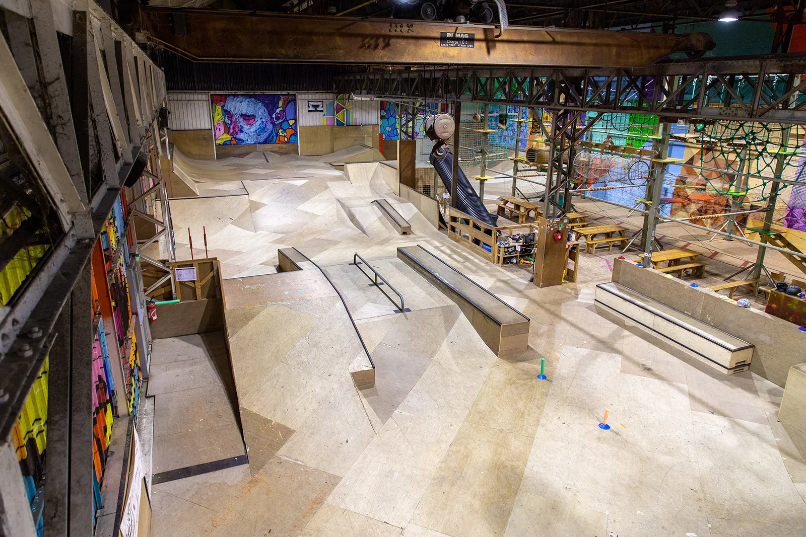Le Skatepark est fait en bois, en intérieur et payant. Dans une ancienne usine il y a plus de 600 mètres carrés de Skatepark avec des curbs, des ledges, des rails, des plans inclinés, des courbes avec du coping tubulaire, des rails ronds, des rails carrés, des mini rampes…