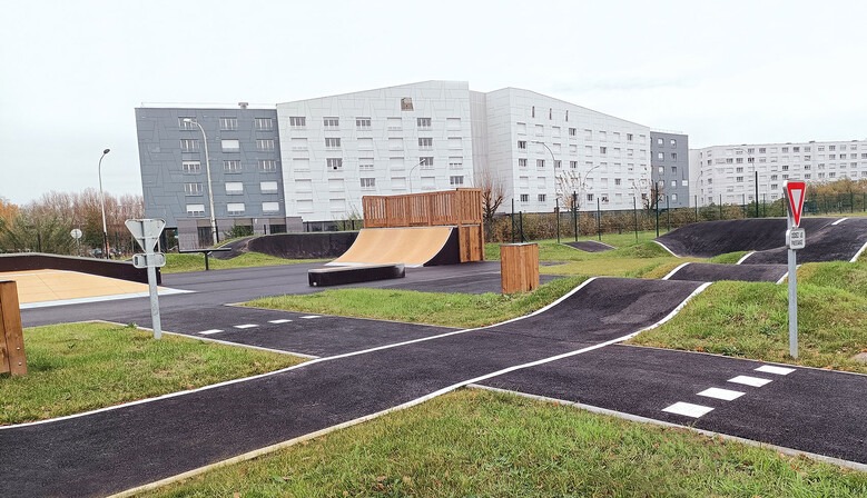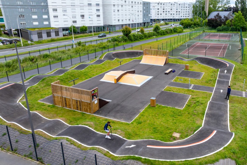 Le pumptrack est carré. Il entoure le skatepark. Corners en bitume, bosses, woops, et plateformes sur chaque corner (virages relevés).