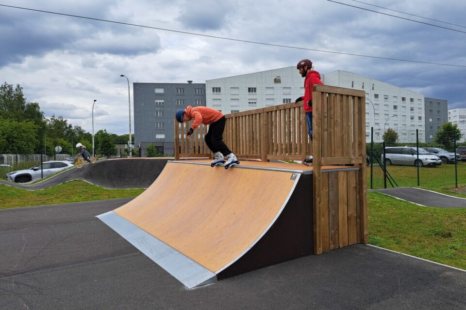 Un skatepark en bois modulaire (SkateLitePro) entouré par une piste de pumptrack en bitume. Ouvert de 8h à 22h, l’équipement sportif est en extérieur et gratuit.
