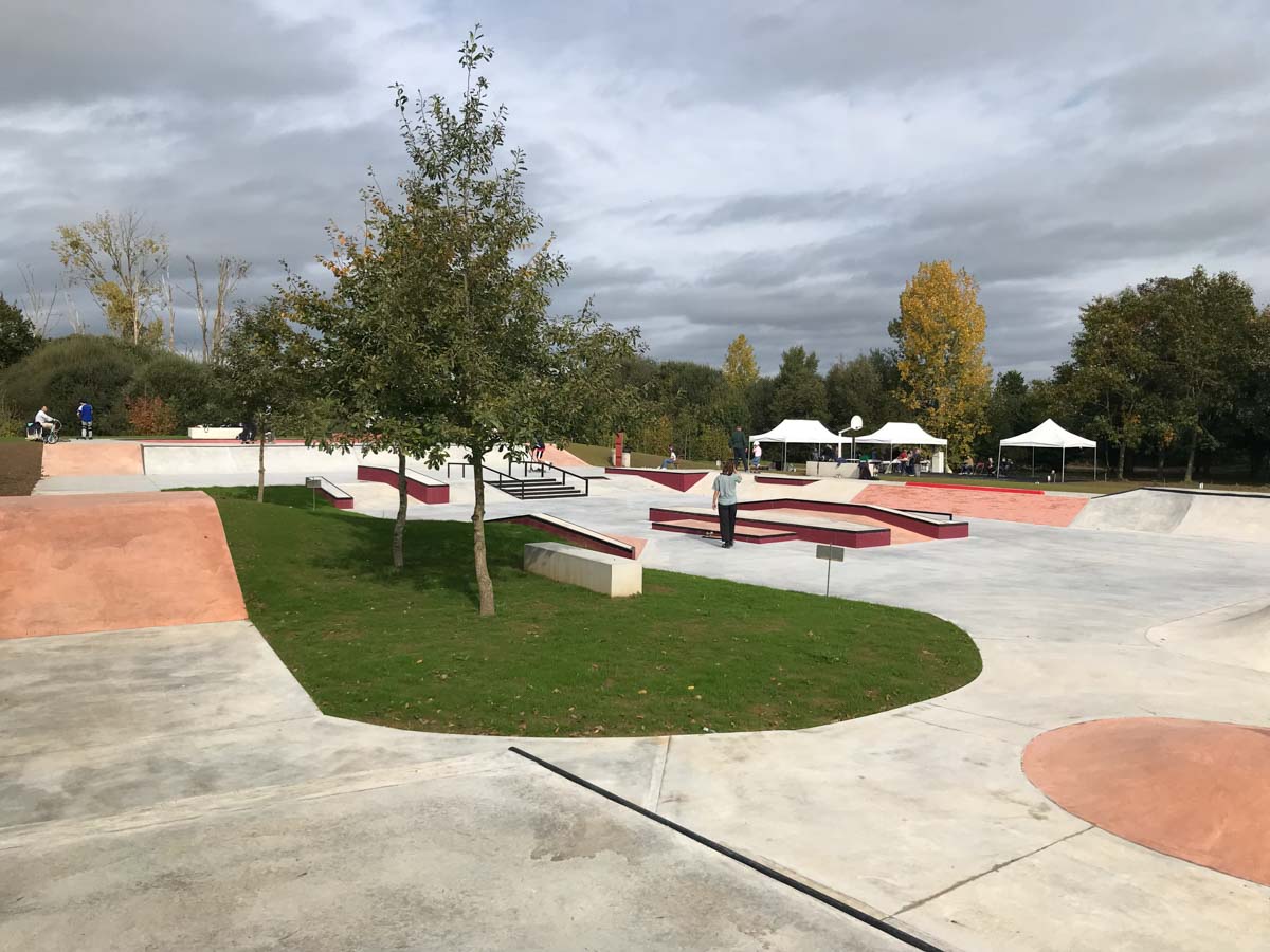 Ce Skatepark est réalisé par l’Atelier360. 1000 m2 de glisse + 150 m2 d’espaces paysagers. Livré en 2024. Le skatepark est en exterieur, en béton et gratuit. Un parc avec des bancs pour les parents.