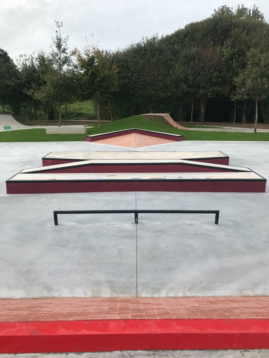 A coté une aire de Street Plaza : Curbs, ledges, plans inclinés, nopings, handrails, rails, pyramides, set de marches, courbes et de l’espace pour rouler tranquille ainsi que des petits walls ride en briquette de maçonnerie. Voici le Skatepark de La Guerche sur Bretagne.