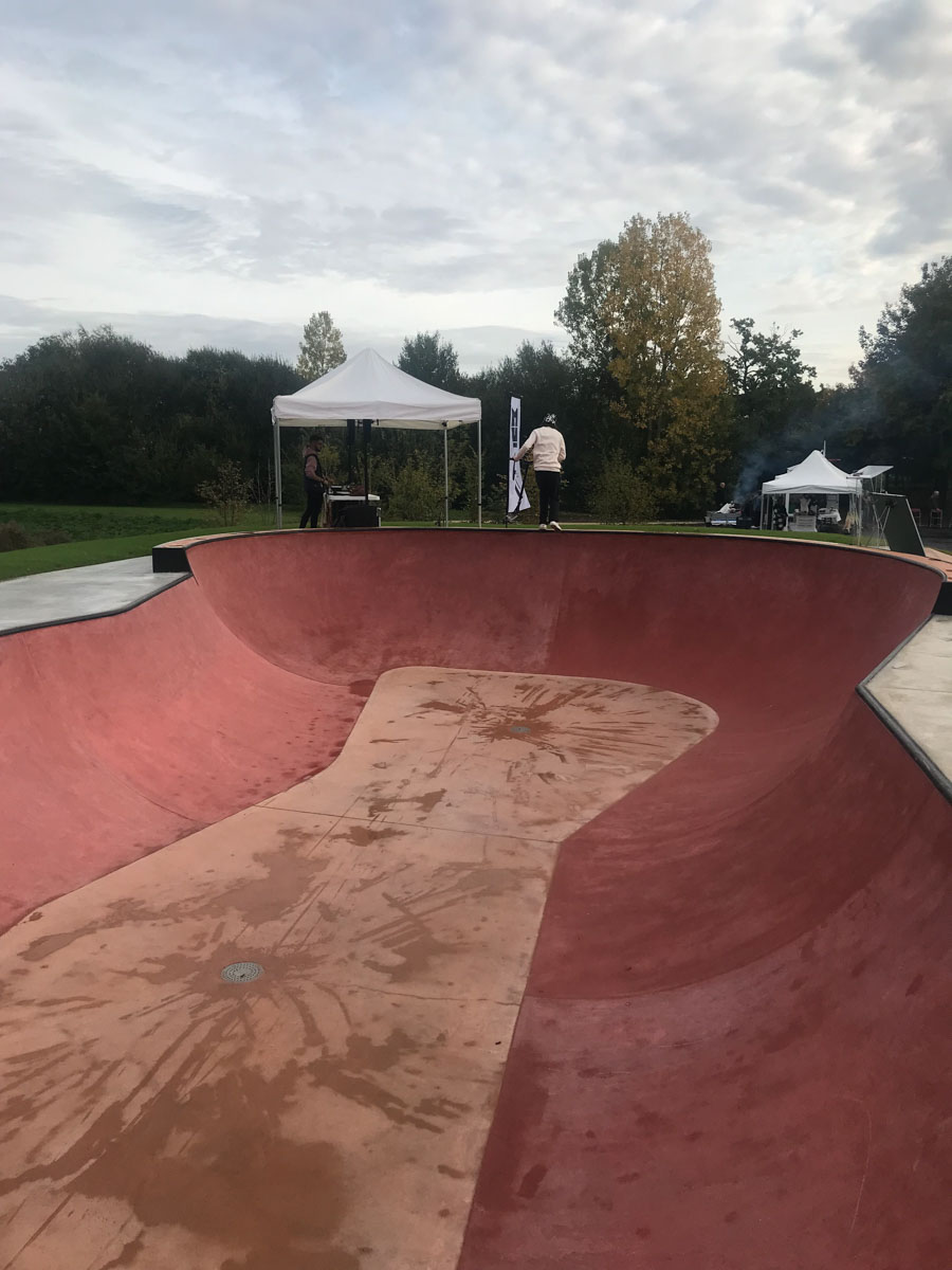 Un Bowl avec deux hips et quatre corners, le coping est en acier. Le bowl d’une jolie couleur pourpre est idéal pour l’apprentissage et le perfectionnement. Il y a une partie avec une petite extension en hauteur dans un corner.