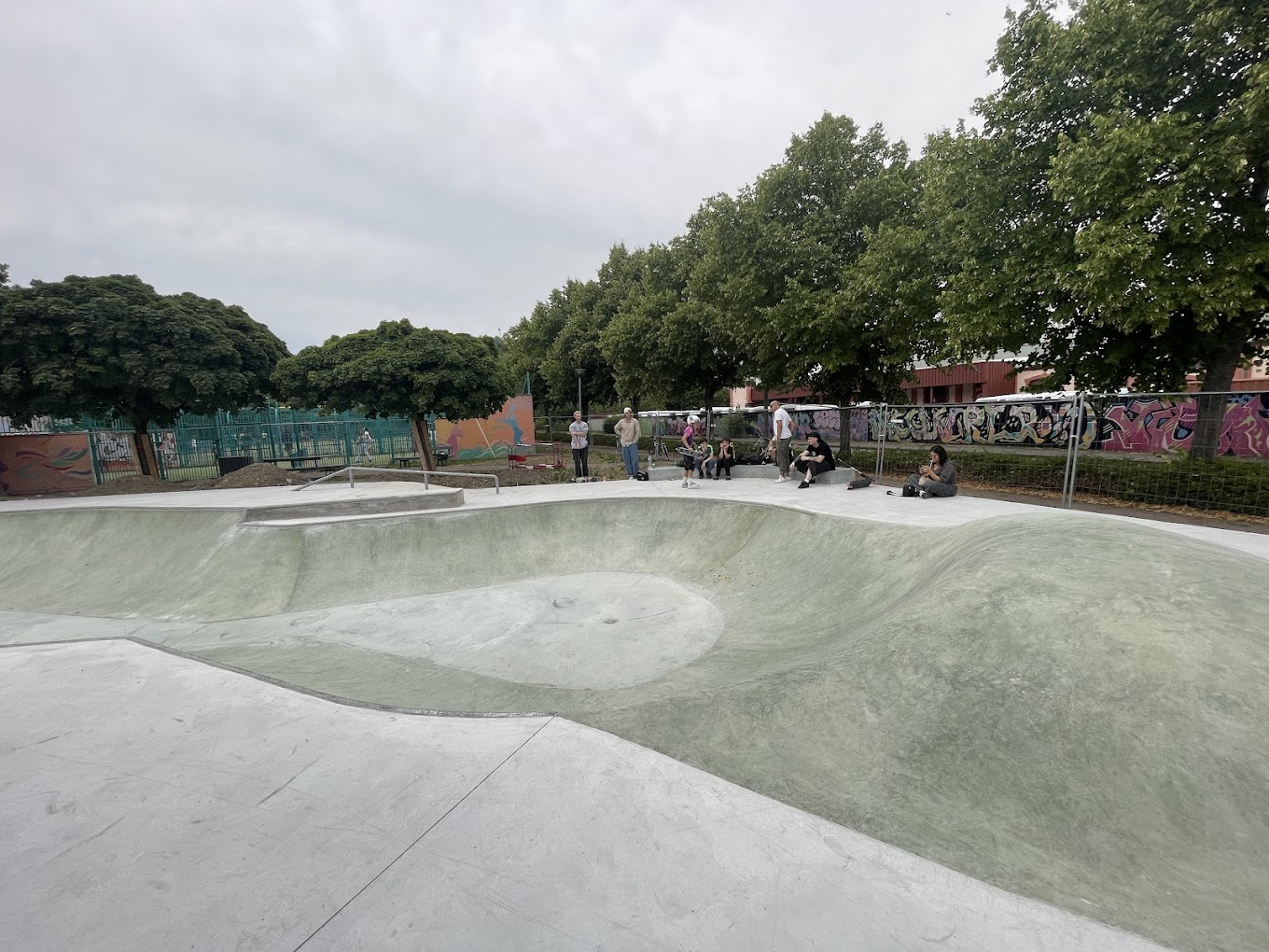Le Bowl avec une langue de béton pour rentrer offre des corners, des hips, du coping en tube d’acier, des extensions, des sorties sur des curbs en extensions. Il est bien adapté pour les Trottinettes, et les autres disciplines peuvent aussi le rider.